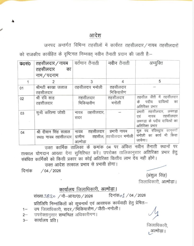 जारी आदेश के अनुसार, तहसीलदार बरखा जलाल को भनोली से भिकियासैंण स्थानांतरित किया गया है, जबकि रवि शाह को भिकियासैंण से भनोली का तहसीलदार बनाया गया है।