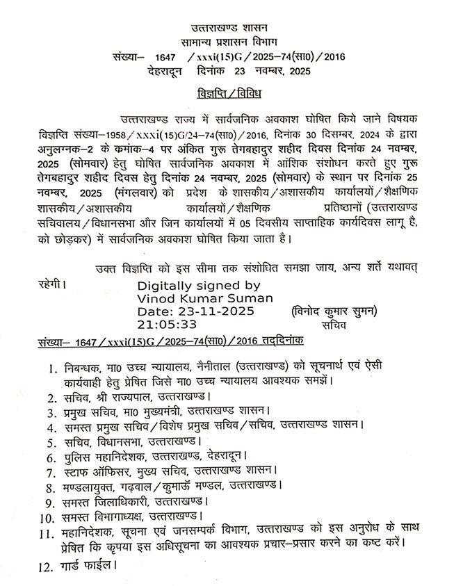 उत्तराखंड उत्तराखंड में इस सार्वजनिक अवकाश की तिथि बदली — अब 25 नवंबर को रहेगा अवकाश admin November 23, 2025 देहरादून– उत्तराखंड शासन ने गुरु तेग बहादुर शहीद दिवस पर घोषित सार्वजनिक अवकाश की तिथि में संशोधन किया है। पहले अवकाश 24 नवंबर (सोमवार) को निर्धारित था, लेकिन अब इसे बदलकर 25 नवंबर 2025 (मंगलवार) कर दिया गया है। Post navigation Previous अपर जिला अधिकारी राजस्व एवं वित्त शैलेंद्र सिंह नेगी ने रविवार को जमरानी बांध परियोजना का स्थलीय निरीक्षणNext Uttarakhand Breaking: फर्जी दिव्यांग प्रमाणपत्र पर 51 शिक्षक भर्ती! शिक्षा विभाग ने भेजा नोटिस, 15 दिन में पेश होने का आदेश WhatsApp Facebook Leave a Reply Cancel replyYour email address will not be published. Required fields are marked *Comment * Name * Email * Website Save my name, email, and website in this browser for the next time I comment. More Stories उत्तराखंड चम्पावत में दिशा बैठक: केंद्र पोषित योजनाओं की प्रगति और कार्य गुणवत्ता की समीक्षा April 20, 2026 admin उत्तराखंड चम्पावत में 93 वर्षीय शिक्षक के शैक्षिक योगदान पर जिलाधिकारी ने किया सम्मानित April 20, 2026 admin उत्तराखंड चम्पावत के पांच सुदूर गांवों में विद्युतीकरण कार्य पूर्ण, 100 से अधिक परिवारों को मिली बिजली April 19, 2026 admin